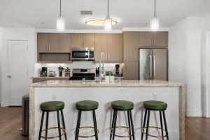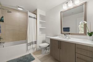 Внутри квартиры имеются две ванные комнаты с ваннами или душевыми кабинами и фенами. Полностью оборудованная кухня включает плиту, холодильник, посудомоечную машину, духовку, микроволновую печь, а также чайные и кофейные принадлежности вместе со всей необходимой посудой. Кондиционер обеспечивает комфорт пребывания гостей, дополнительно доступны телевизор с плоским экраном и потоковыми сервисами, стиральная машина, гардеробный шкаф, зона отдыха с диваном и рабочим столом плюс постельное белье и полотенца.