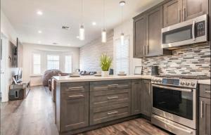 Полностью оборудованная кухня включает современные приборы: духовку, плиту на поверхности плиты микроволновую печь посудомоечную машину холодильник тостер кофеварку чайник сушилку стиральную машину кухонную утварь — всё необходимое для комфортного пребывания. Дополнительные удобства включают телевизор с плоским экраном покрытие Wi-Fi по всему дому бесплатную частную парковку на территории включая зарядные станции для электромобилей огнетушитель — гарантированная безопасность гостей.