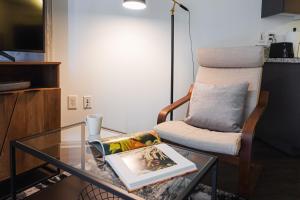Просторная студия оборудована двумя кроватями и системой кондиционирования воздуха с отоплением для круглогодичного комфорта. Гости могут пользоваться полностью оборудованной мини-кухней с духовкой, посудомоечной машиной, холодильником, микроволновой печью, тостером и принадлежностями для приготовления чая и кофе. В номере также предоставляются постельное белье, утюг с гладильной доской, шкаф для одежды и стиральная машина с сушилкой.